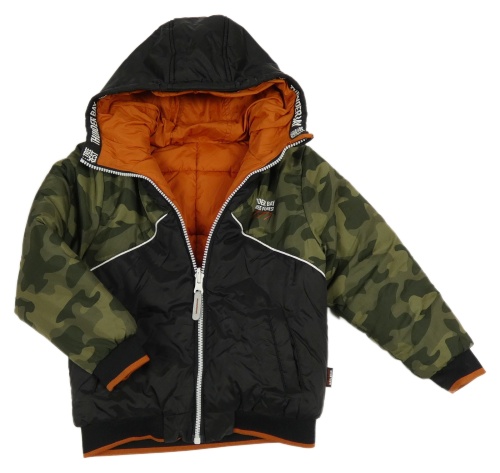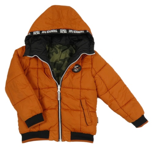 Oranžová šusťáková zimní oboustranná bunda s kapucí a nášivkou