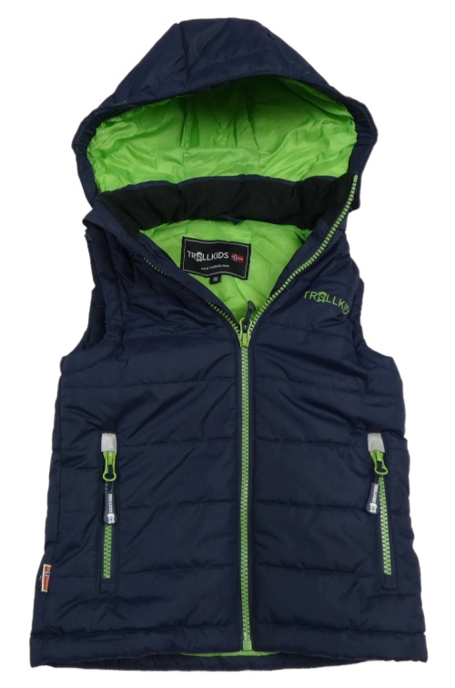 Tmavomodrá prošívaná šusťáková zateplená vesta s logem a odepínací kapucí TROLLKIDS
