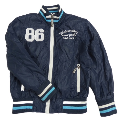 Tmavomodrý šusťákový jarní bomber s číslem a modrým lemem