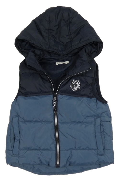 Tmavomodro-modrošedá prošívaná šusťáková zateplená vesta s písmenky a odepínací kapucí H&M