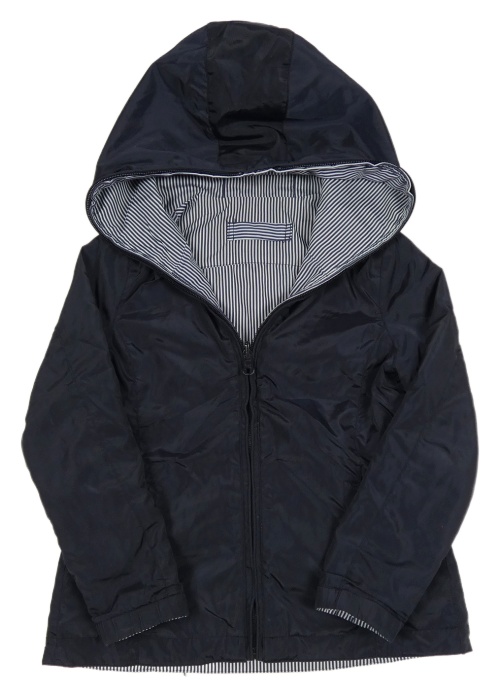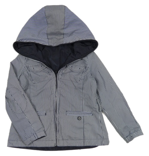 Tmavomodro-bílá pruhovaná šusťáková jarní oboustranná bunda s kapucí