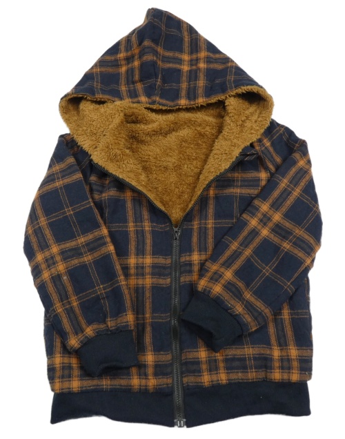 Tmavomodro-oranžová kostkovaná flanelová zateplená bunda s kapucí