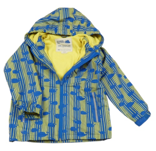 Tmavomodro-žlutá pruhovaná voděodolná lehce zateplená bunda s velrybami a kapucí