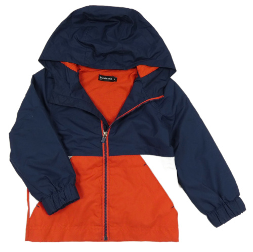 Tmavomodro-červeno-světlešedá šusťáková jarní bunda s kapucí in extenso