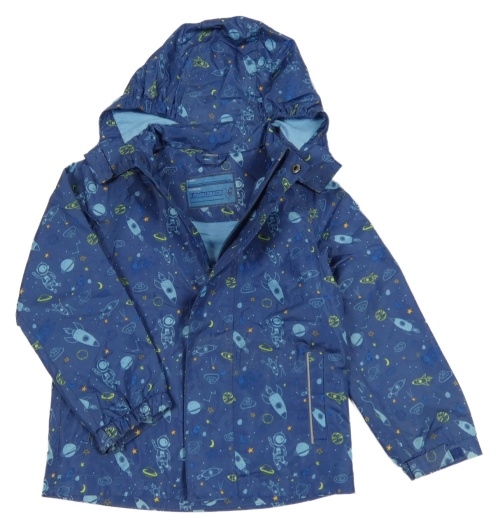 Modro/tmavomodrá šusťáková jarní bunda s raketami a kosmonauty a planetami a odepínací kapucí POCOPIANO