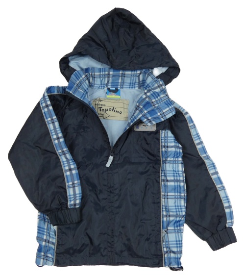 Tmavomodro-modro/kostkovaná šusťáková jarní bunda s nášivkou a odepínací kapucí Topolino