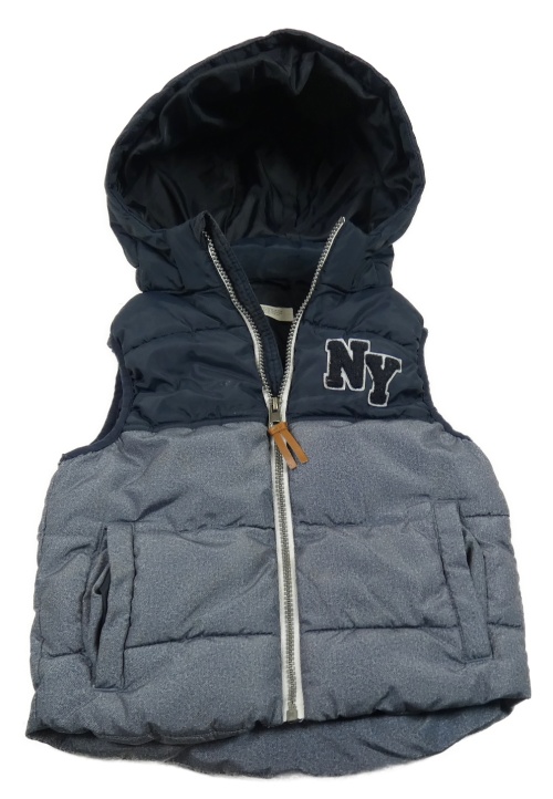 Tmavomodro-melírovaná prošívaná šusťáková zateplená vesta s písmenky a odepínací kapucí H&M
