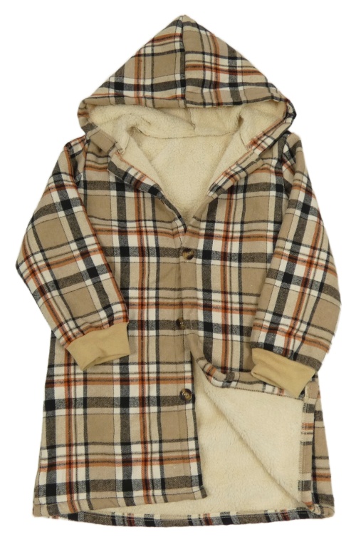 Hnědobéžovo-černo-bílo-cihlový kostkovaný vzorovaný zateplený kabát s kapucí