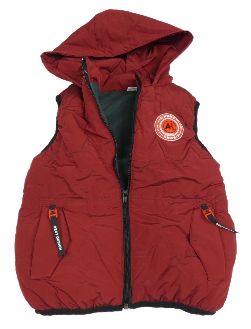 Červená šusťáková zateplená vesta s nášivkou a kapucí