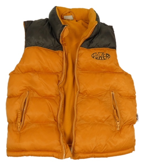 Oranžovo-hnědá šusťáková prošívaná zateplená vesta s nápisem