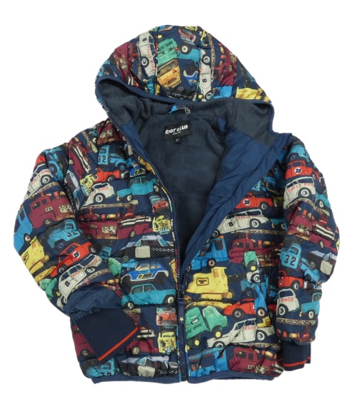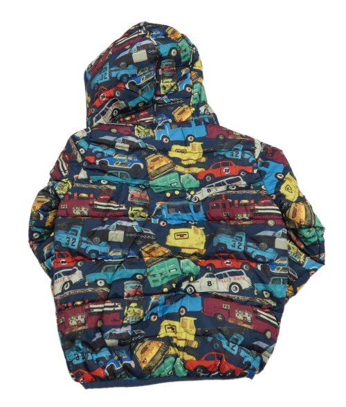 Tmavomodro-barevná šusťáková zateplená bunda s auty a kapucí
