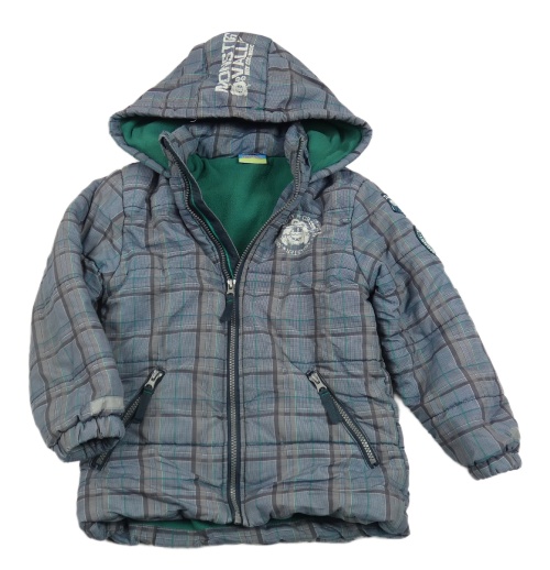 Tmavomodro-bílo-hnědá kostkovaná šusťáková zimní bunda s potiskem a kapucí Topolino