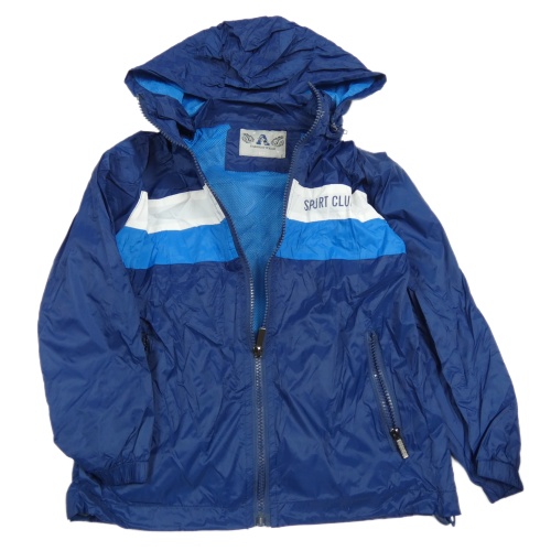 Tmavomodro-bílá šusťáková jarní bunda s nápisem a kapucí