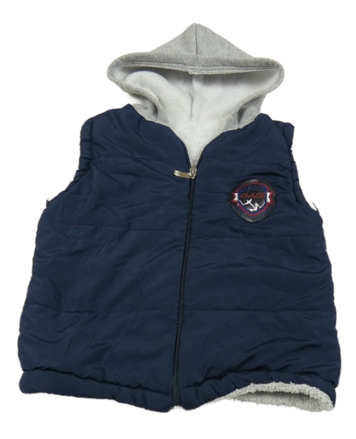 Tmavomodrá šusťáková zateplená vesta s nášivkou a kapucí
