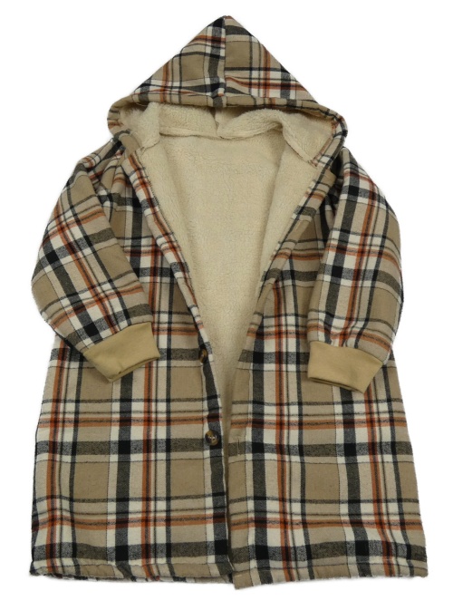 Hnědo-černo-béžový kostkovaný zateplený kabát s kapucí