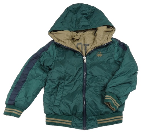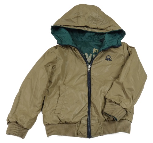 Smaragdový šusťákový zateplený oboustranný bomber s nápisy a pruhy a kapucí Benetton