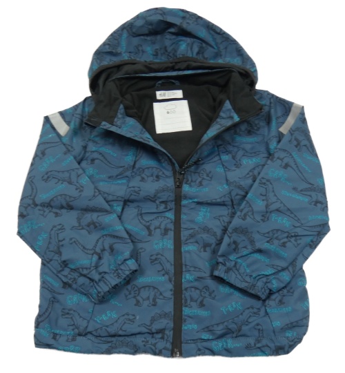 Tmavomodrošedá šusťáková jarní bunda s dinosaury a odepínací kapucí H&M