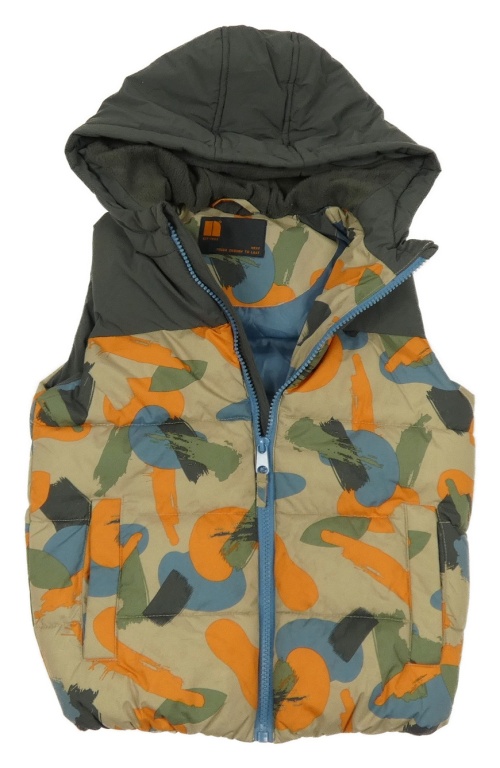Tmavošedo-béžovo-barevná vzorovaná šusťáková zateplená vesta s kapucí