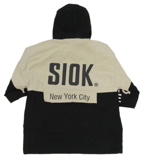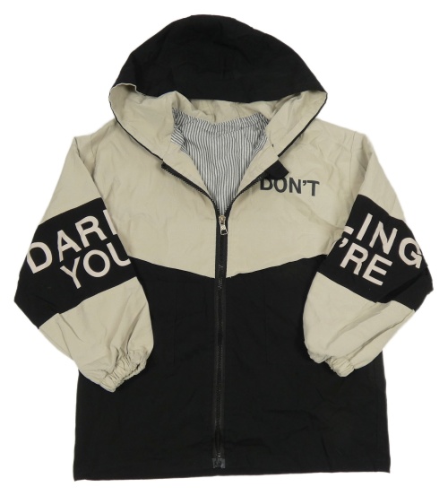 Černo-béžová šusťáková podzimní bunda s nápisy a kapucí