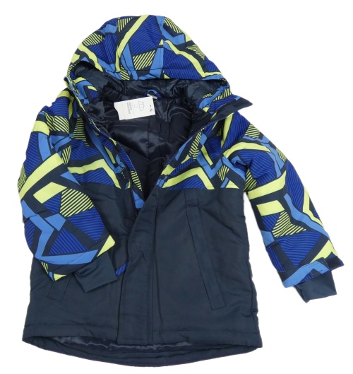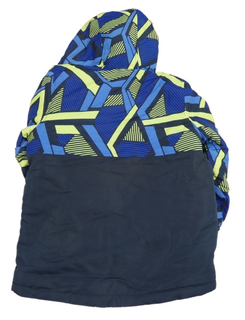 Nové - tmavomodro-safírovo-modro-citronová šusťáková zimní bunda se vzorem a kapucí little kids