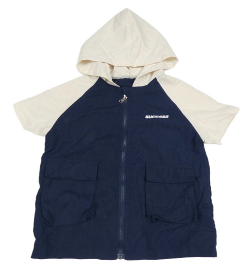 Tmavomodro-smetanová šusťáková vesta s nápisem a kapucí