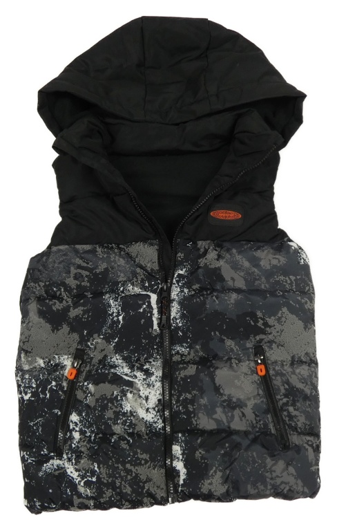 Černo-tmavošedá skvrnitá prošívaná šusťáková zateplená vesta s nášivkou a kapucí F&F
