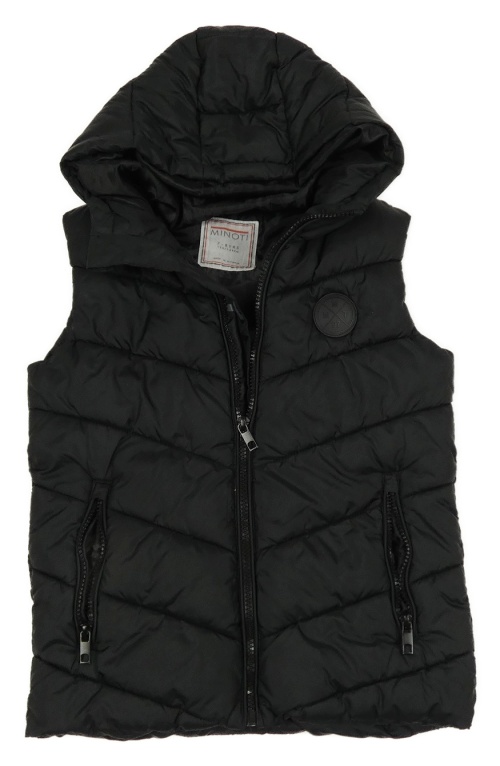 Černá šusťáková zateplená vesta s nášivkou a kapucí Minoti