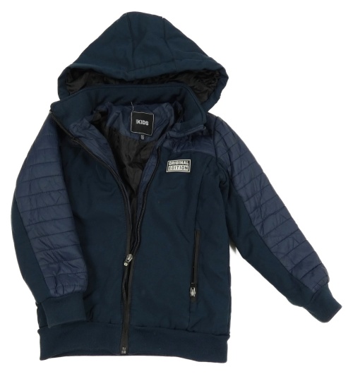 Tmavomodrá šusťáková zateplená bunda s nášivkou a kapucí