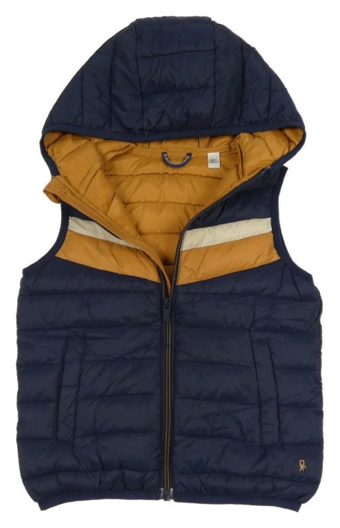 Tmavomodro-hnědá šusťáková prošívaná zateplená vesta s kapucí