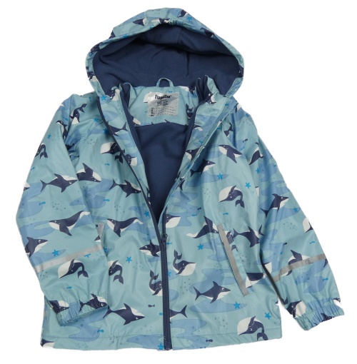 Světlemodrá nepromokavá lehce zateplená bunda s velrybami a kapucí Lupilu