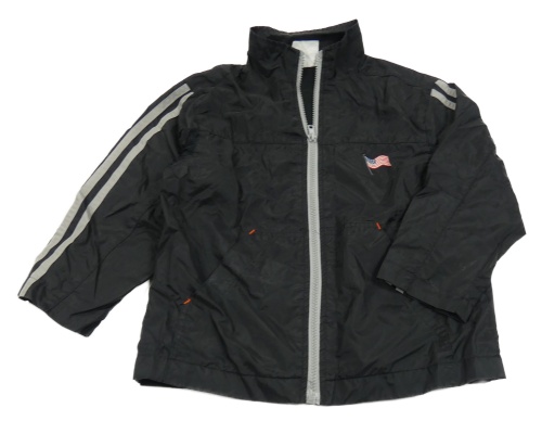 Černo-šedá propínací jarní bunda s pruhy a vlajkou