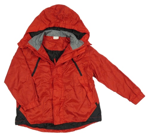 Červeno-černá šusťáková jarní bunda s ukrývací kapucí