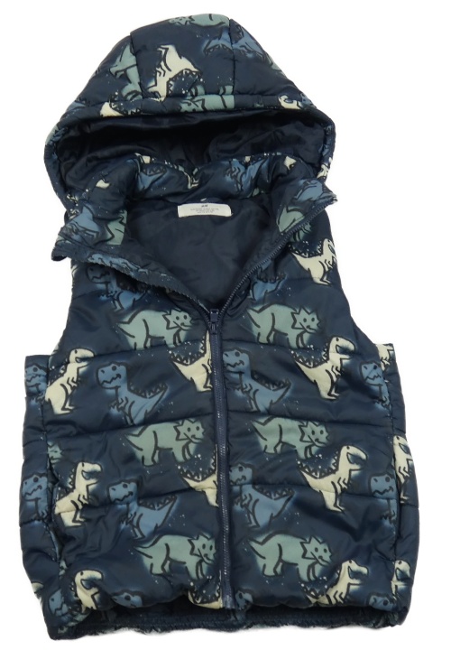 Tmavomodrá prošívaná šusťáková zateplená vesta s dinosaury a odepínací kapucí H&M