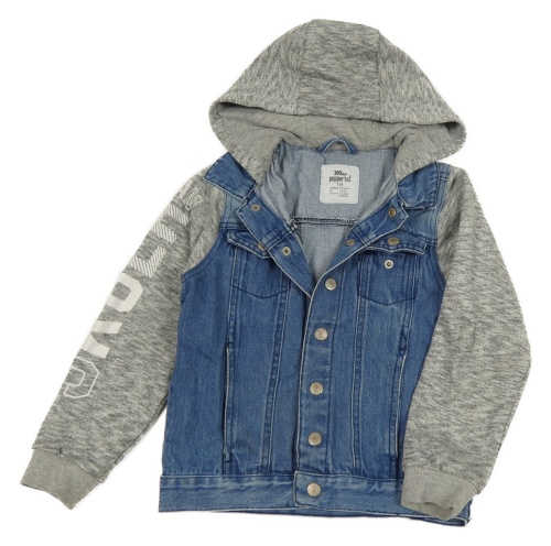 Modrá riflová bunda s šedo/bílými melírovanými teplákovými rukávy s nápisem a kapucí Pepperts!