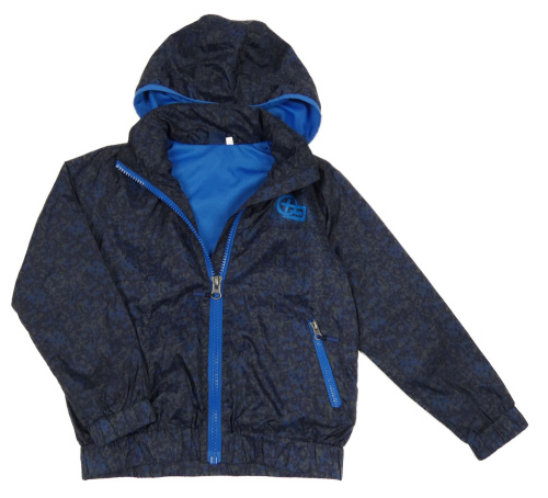 Tmavomodro-khaki vzorovaná šusťáková jarní bunda s potiskem a kapucí