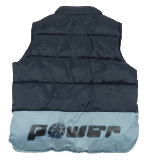 Tmavomodro-modrá prošívaná šusťáková zateplená vesta s nášivkou a nápisem