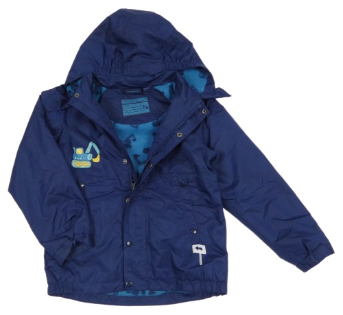 Tmavomodrá šusťáková jarní bunda s buldozerem a odepínací kapucí impidimpi