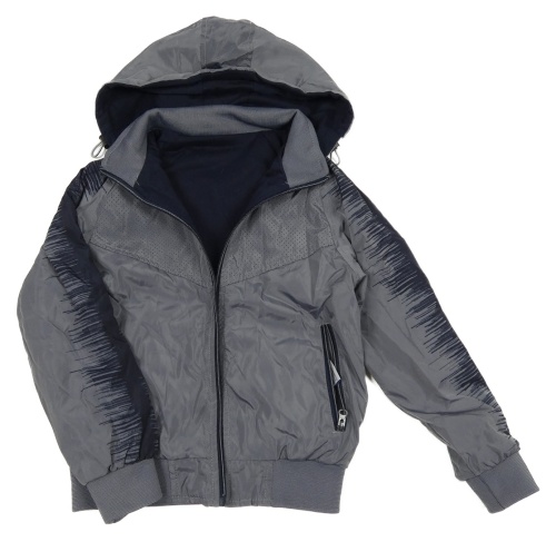 Tmavošedo/tmavomodrý šusťákový jarní bomber se vzorem a odepínací kapucí