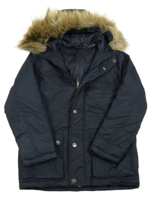 Tmavomodrá šusťáková zateplená bunda s kapsami a kapucí s kožešinou