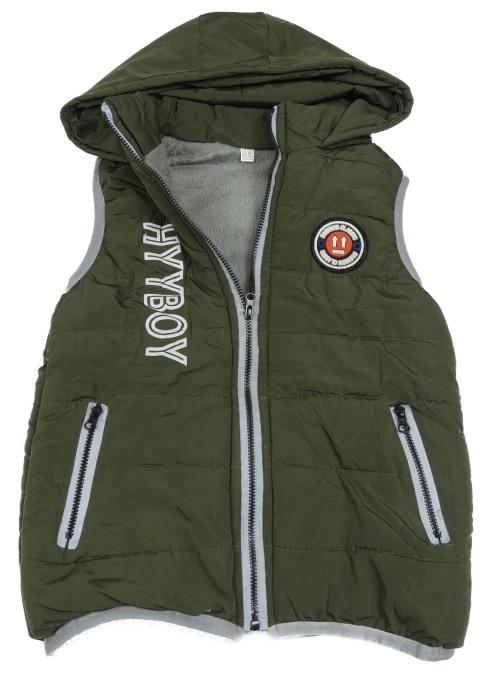 Khaki šusťáková zateplená vesta s nápisem a nášivkou a kapucí