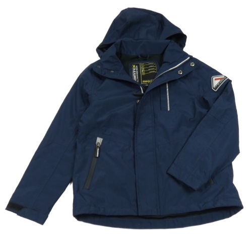 Tmavomodrá šusťáková jarní bunda s nášivkou a kapucí