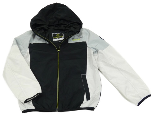 Černo-bílo-šedá šusťáková jarní bunda s nápisem a kapucí C&A