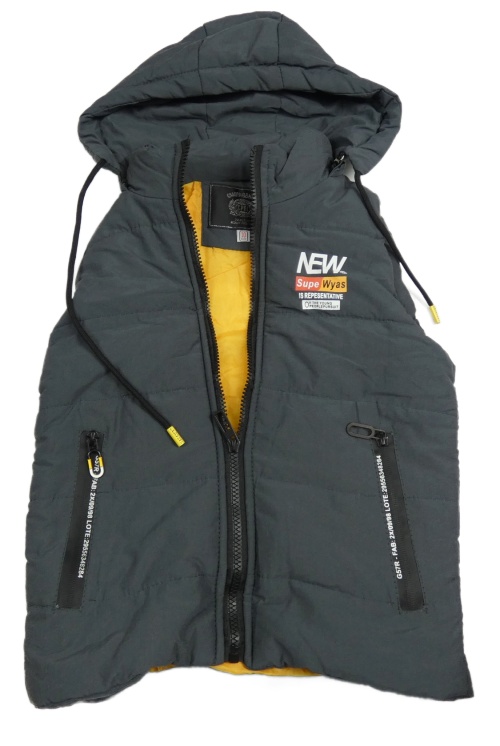 Antracitová šusťáková zateplená vesta s nápisem a kapucí