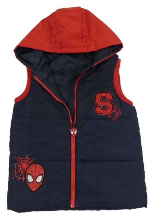 Tmavomodro-červená šusťáková zateplená vesta se Spidermanem a kapucí Marvel