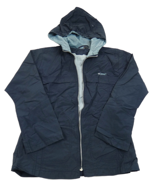 Tmavomodrá šusťáková jarní bunda s nápisem a kapucí