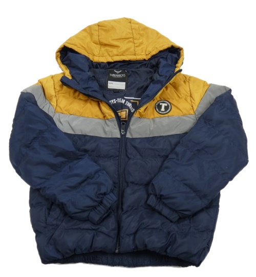Hořčicovo-stříbrno-šedá šusťáková zimní bunda s nášivkou a kapucí