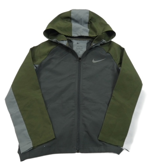 Antracitovo-khaki-tmavošedá šusťáková bunda s logem a kapucí Nike