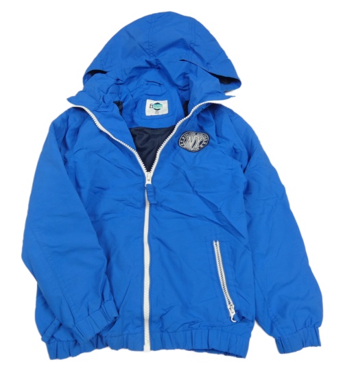 Modrá šusťáková jarní bunda s nášivkou a kapucí