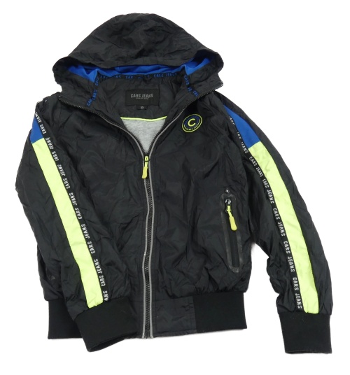 Černý šusťákový jarní bomber s nášivkou a pruhy a logy a kapucí CARS JEANS
