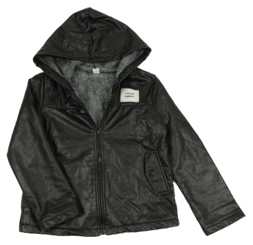 Černá koženková zateplená bunda s nášivkou a kapucí SHEIN